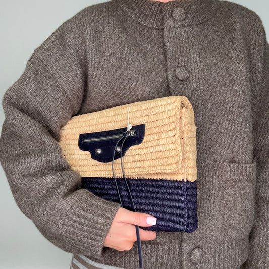 Balenciaga Giant 12 Raffia Clutch In Beige & Navy