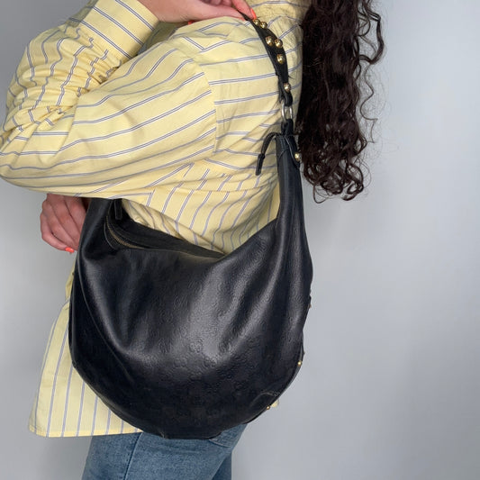 Gucci Guccissima Black Leather Hobo With Studded Shoulder Strap