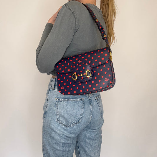 Gucci Horsebit 1955 Shanghai Shoulder Bag – Navy Polka Dot Calfskin
