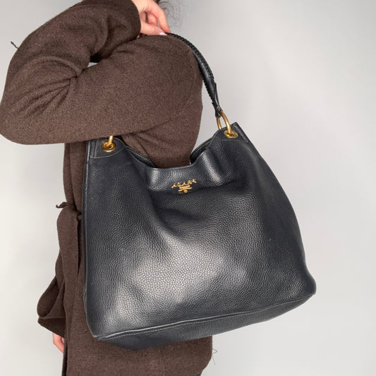 Prada Vitello Daino Hobo In Black Pebbled Leather