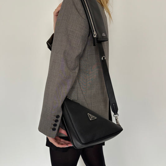Prada Black Saffiano and Vitello Leather Triangle Double Messenger
