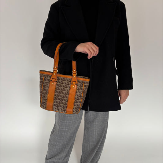 Fendi Zucchino and Orange Leather Trim Open Tote Bag
