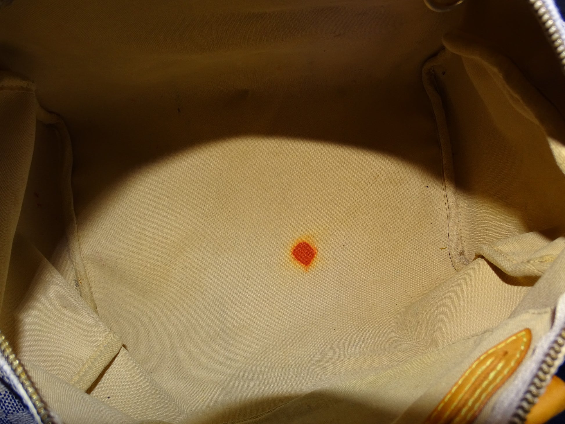 - Condition Notes: Corner wear - piping exposed, darkening to the vachetta, large red ink stain to the interior (coming through at the base), some marks to the canvas