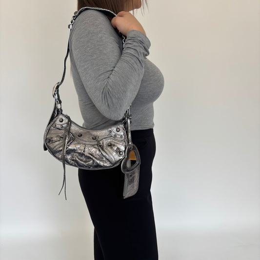 Balenciaga Le Cagole Shoulder Bag XS in Silver Metallized Arena Lambskin