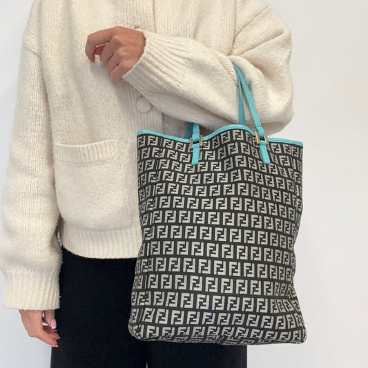 Fendi Black Zucchino Canvas Blue Leather Trim Tote