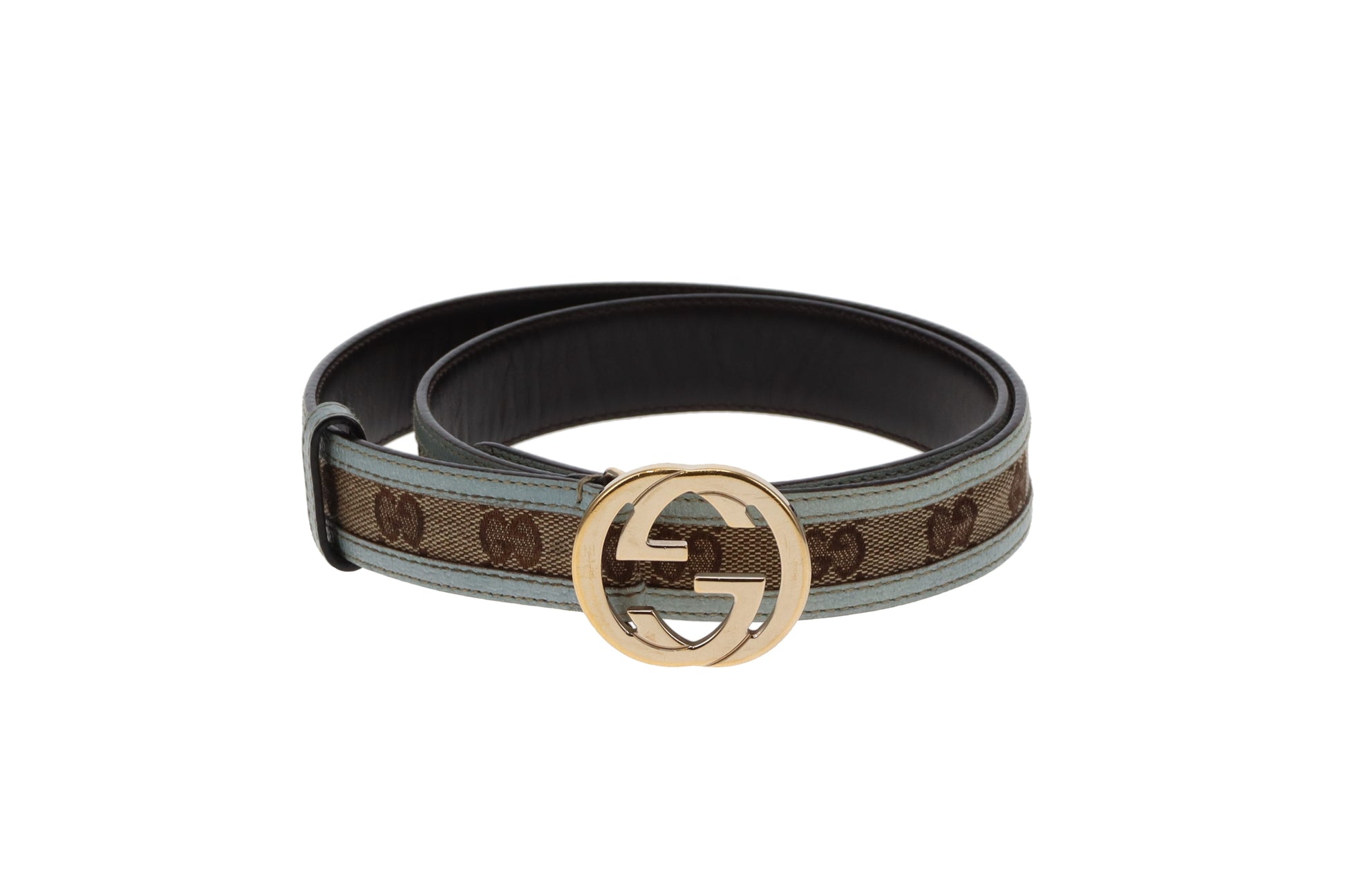 Gucci GG Canvas Belt With Steel Blue Leather Trims 85/34